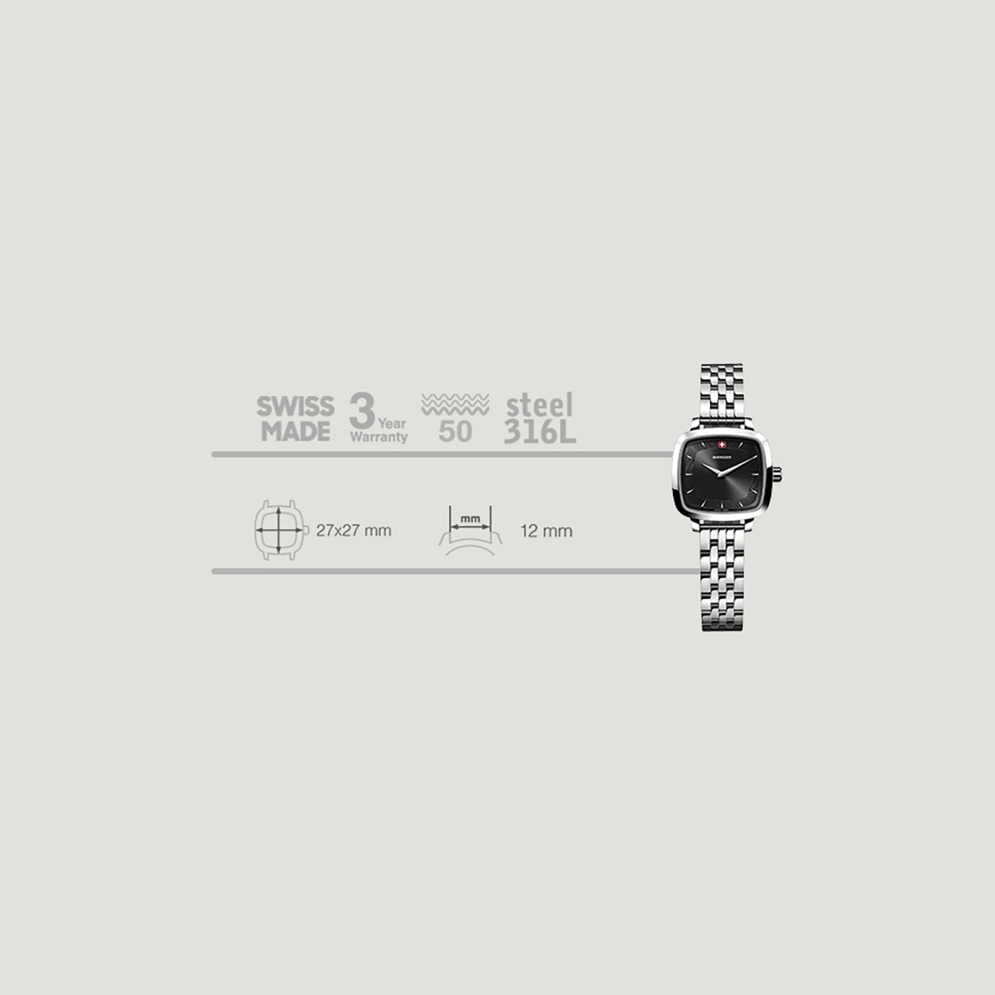 Item no01.1911.102Dial colorBlackCase colorsilverStrap colorSilverBezel colorsilverCase materialStainless steelStrap materialRustproof stainless steelWater resistance50 mDiameter27 mmStrap closureSliding buckleCrystal materialMineralMovement caliberRonda 772MovementAnalogue quartz movementCollectionVintage ClassicStrap closure materialRustproof stainless steelCrystal specificationSapphire coatingLug width12 mmCase finishPolishedWeight52.06 gNet height7 mmPower reserveNoBattery364Second time zoneNoDial constructionStickersBezel rotationFixed bezelDial finishSunburst finishPower gaugeNoCountdown timerNoBezel materialStainless steelStrap closure finishPolishedCase back materialStainless steelCase back closurePressed-in case backCountry of OriginSwitzerland