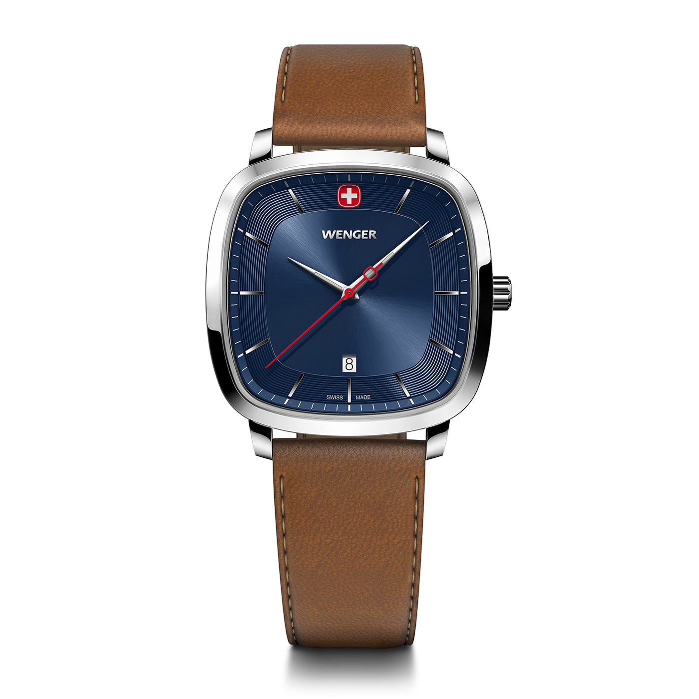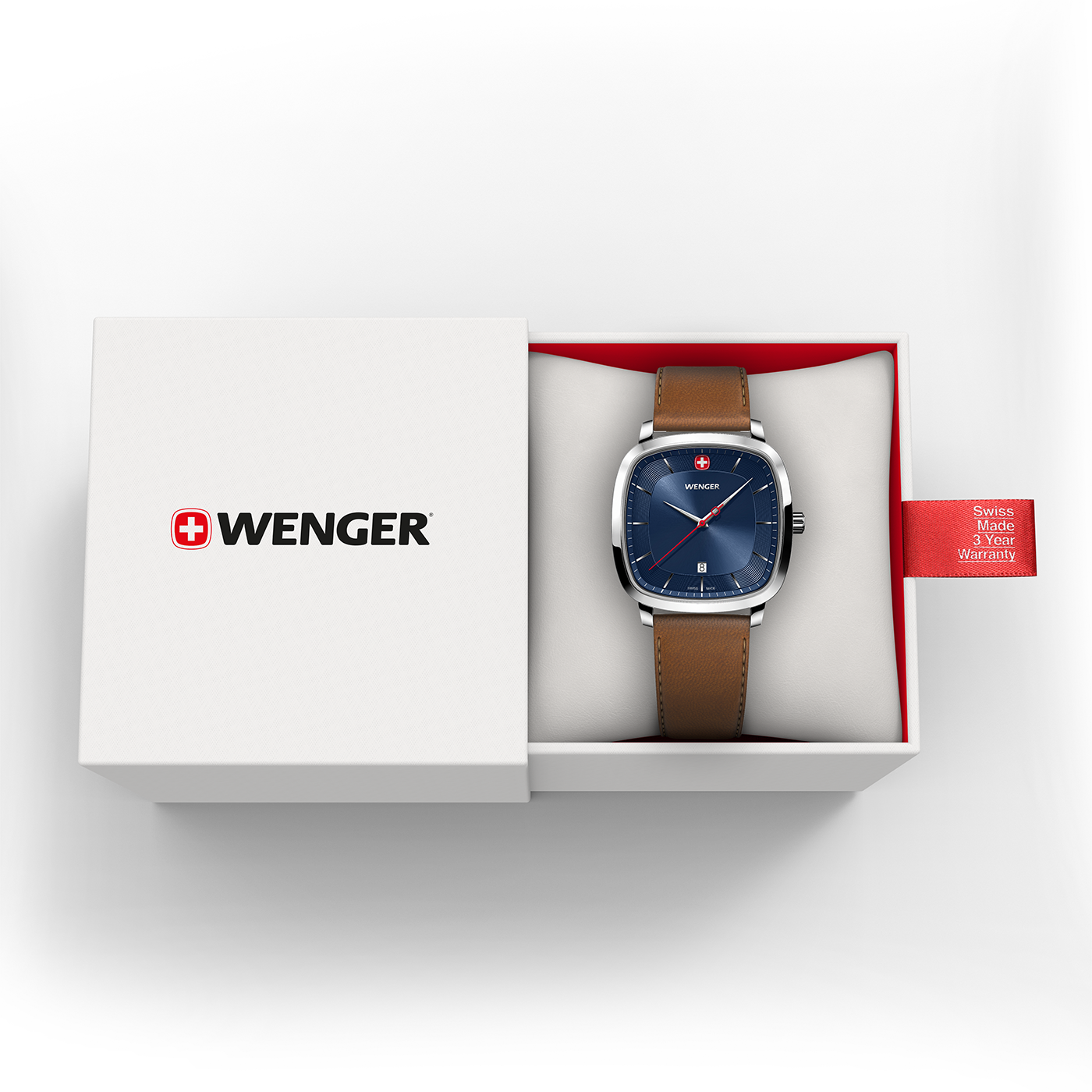 The Vintage Classic is a timeless and modern piece of technology that always makes a statement. Our innovative, super elliptical case echoes the shape of the Wenger logo and is complemented by a classic sun-brushed dial, silver-coloured indexes and a date window at 6 o'clock. The red and white logo at 12 o'clock refers to the inherent Swissness and makes the watch the ideal accessory for modern city dwellers. So that you can rely on our quality, there is an international 3-year guarantee. Some of the bracelets are made partly from bio-based material, while the stainless steel bracelets are equipped with a sliding buckle so that you can adjust the size individually. There is also a quick-change system if you fancy a different bracelet. Add timeless style with that certain something to your look with the Vintage Classic.